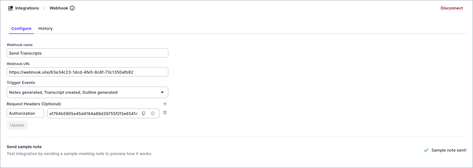 Krisp will send a sample payload to your Webhook URL so you can confirm your system receives it.