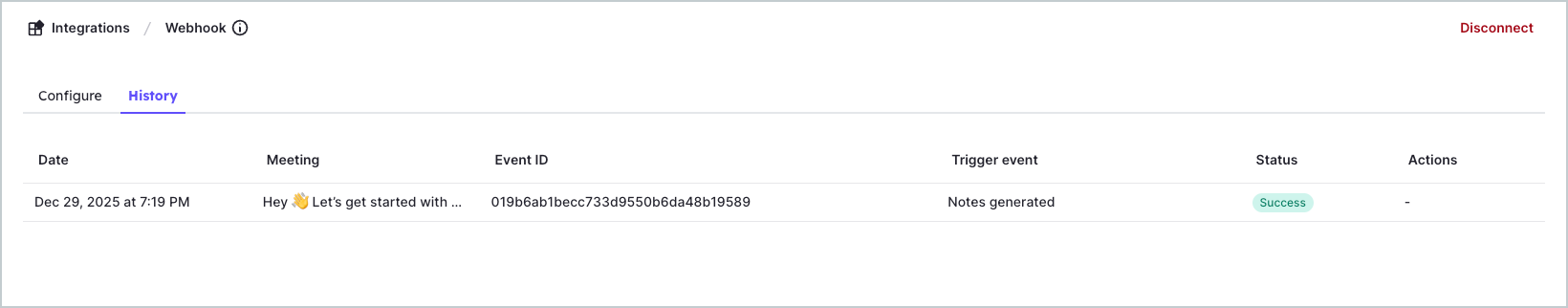 Open the webhook’s History tab to see recent deliveries, including: