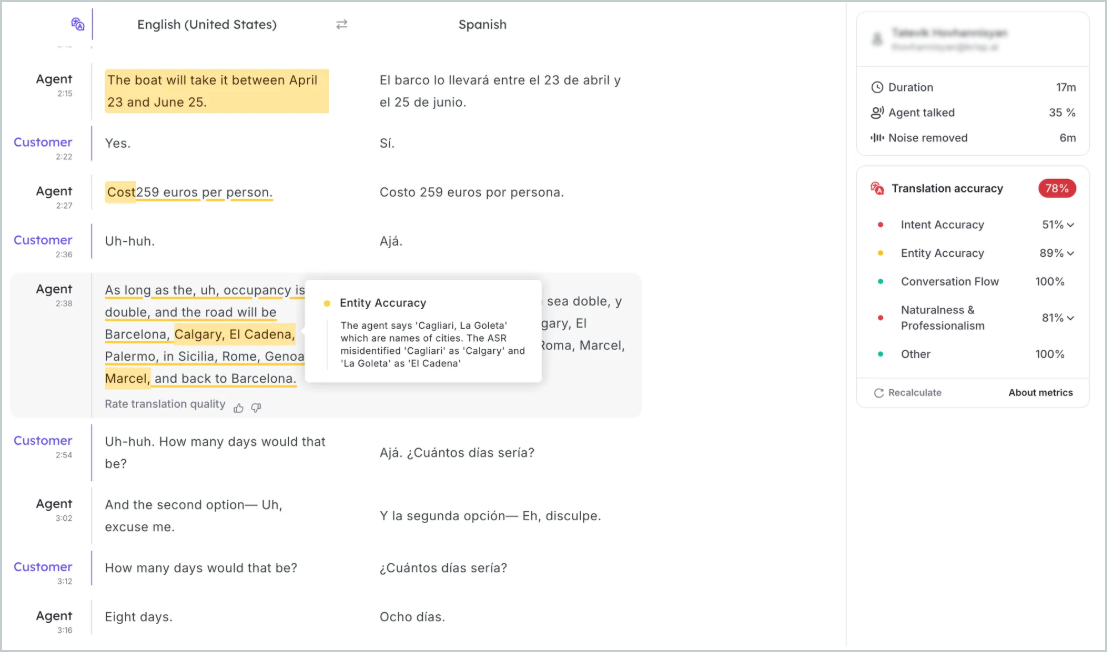 The goal is to evaluate how effectively meaning was preserved across languages and to identify where translation mistakes caused confusion or required the speaker to repeat and clarify information. This way, it gives admins the data to monitor every call and improve performance at scale.