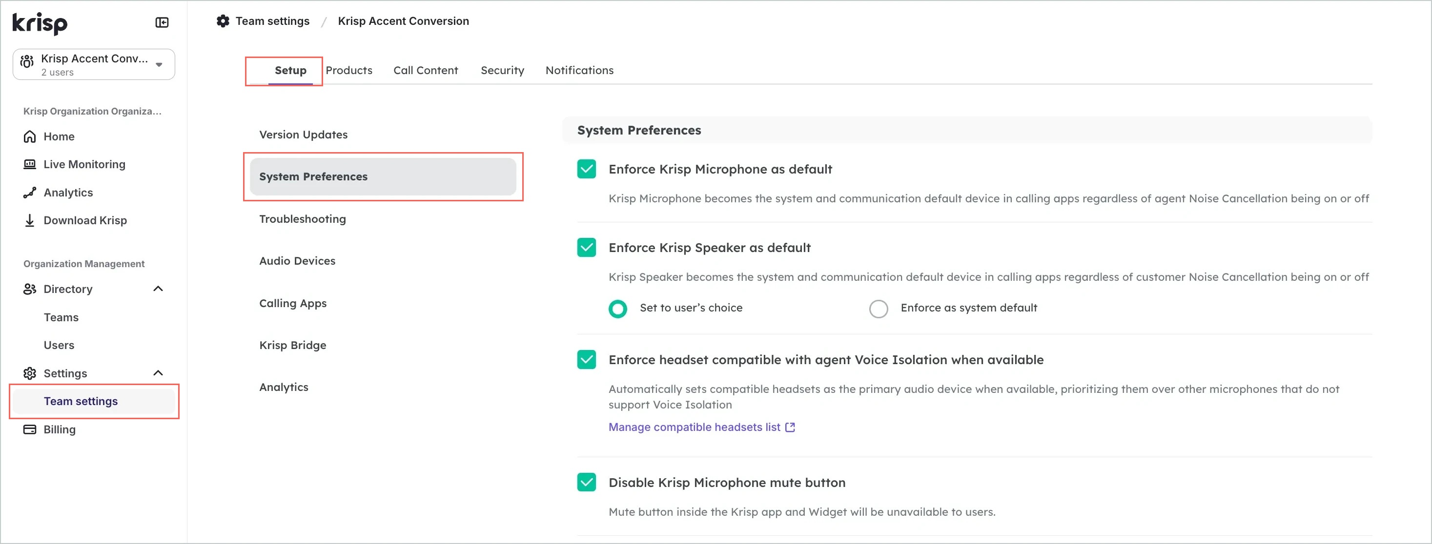 - Enable Enforce Krisp Microphone as system default if you’re using Agent Accent Conversion