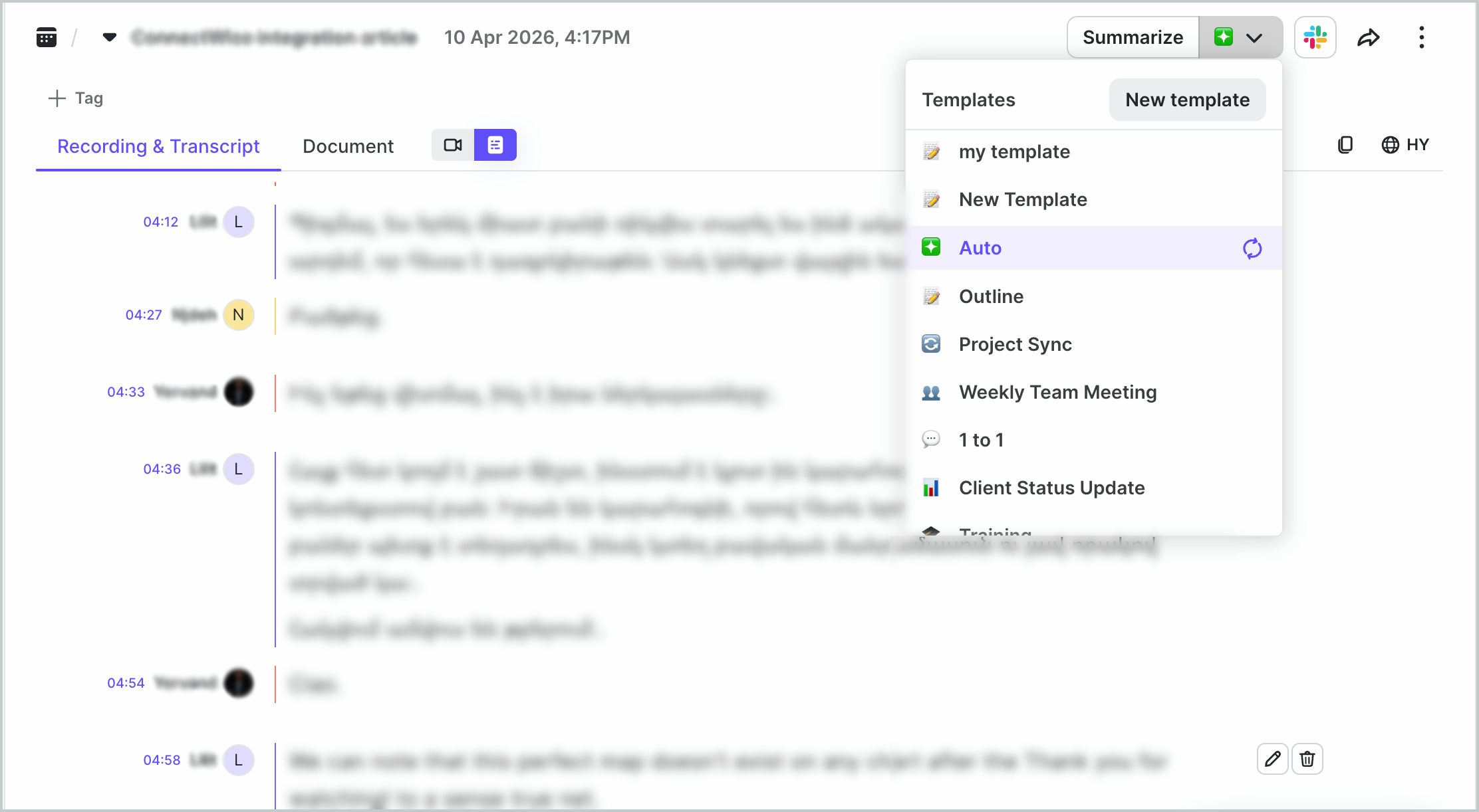If a meeting has already been summarized, you can switch to a different template and regenerate the summary at any time.