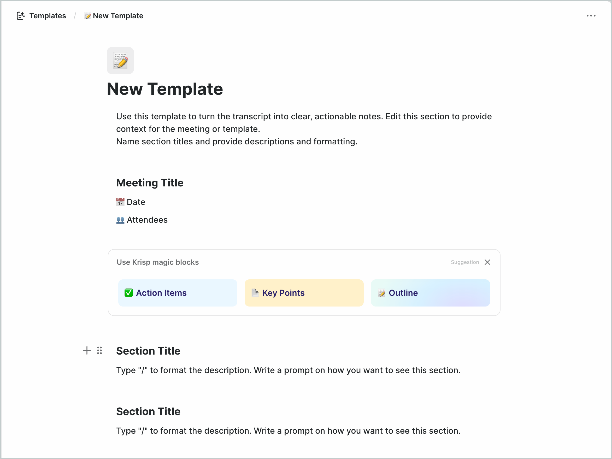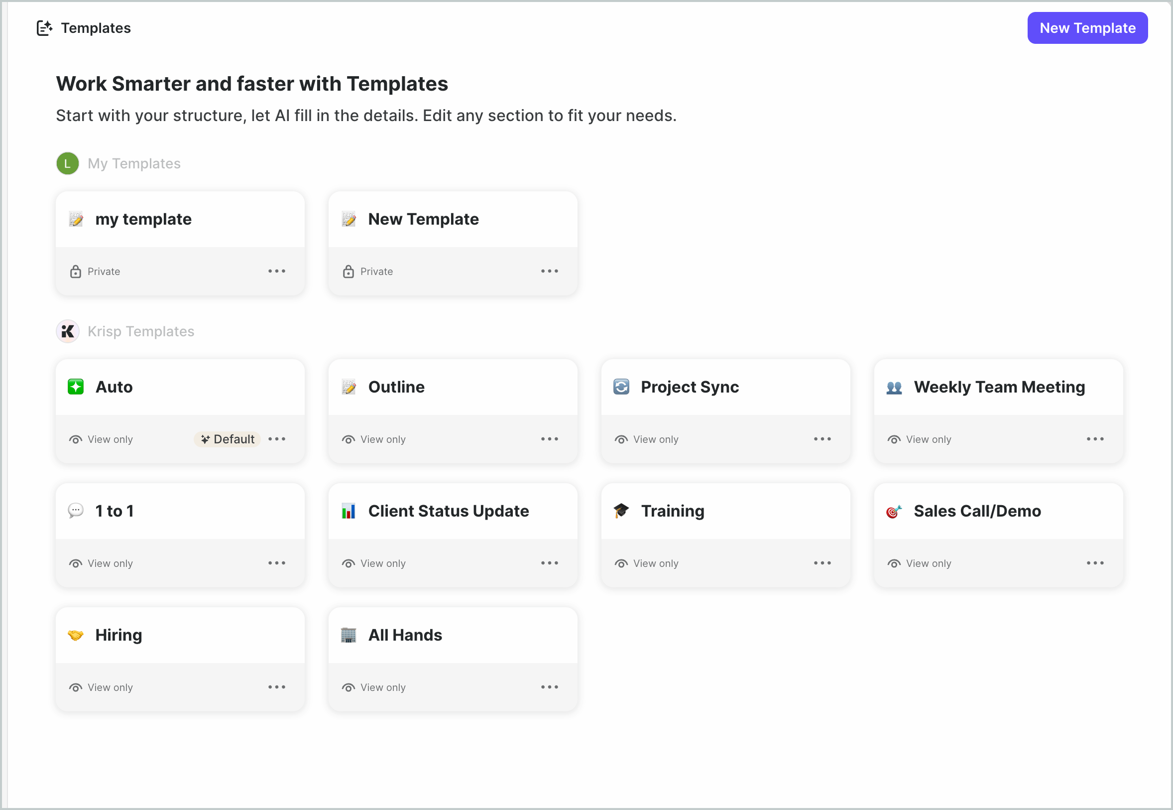- Krisp Templates: Starter templates created by Krisp. These cannot be edited directly, but you can duplicate any Krisp template to create your own copy and customize it.